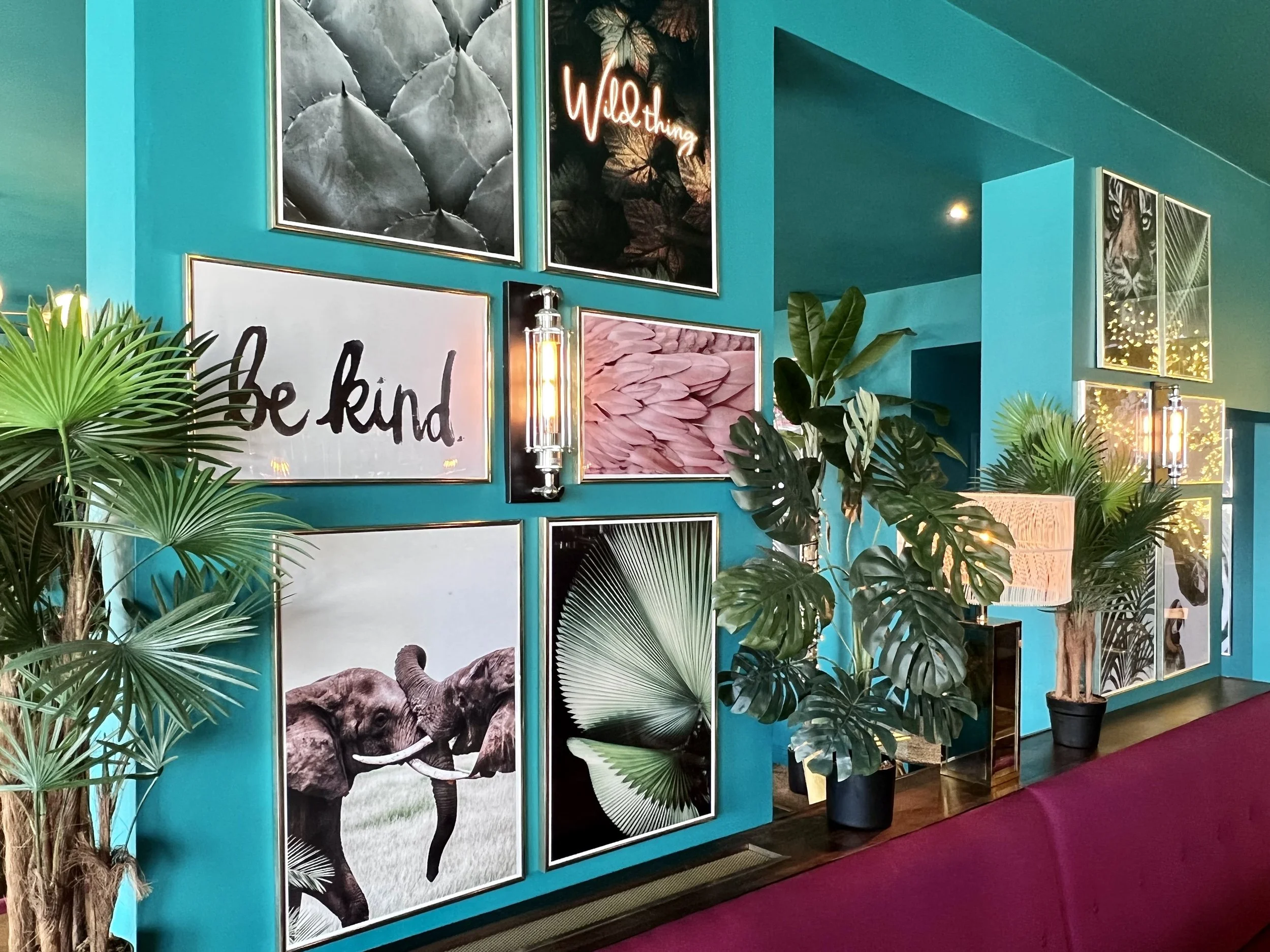 Spices are at the heart of Bonzai's identity, woven seamlessly through every element—from the cuisine to the décor. The interior design boldly showcases an eclectic mix of Asian influences: striking custom gold-framed artwork lines the walls, while a huge illuminated faux cherry blossom tree takes center stage. The rear wall features a stunning junglescape complete with monkeys and lush palm trees, complemented by playful, hanging monkey lights near the bar. Bamboo detailing adds Eastern material richness, while strategically placed mirrors and glass create movement and reflection, bringing intimacy to the vibrant and busy atmosphere.