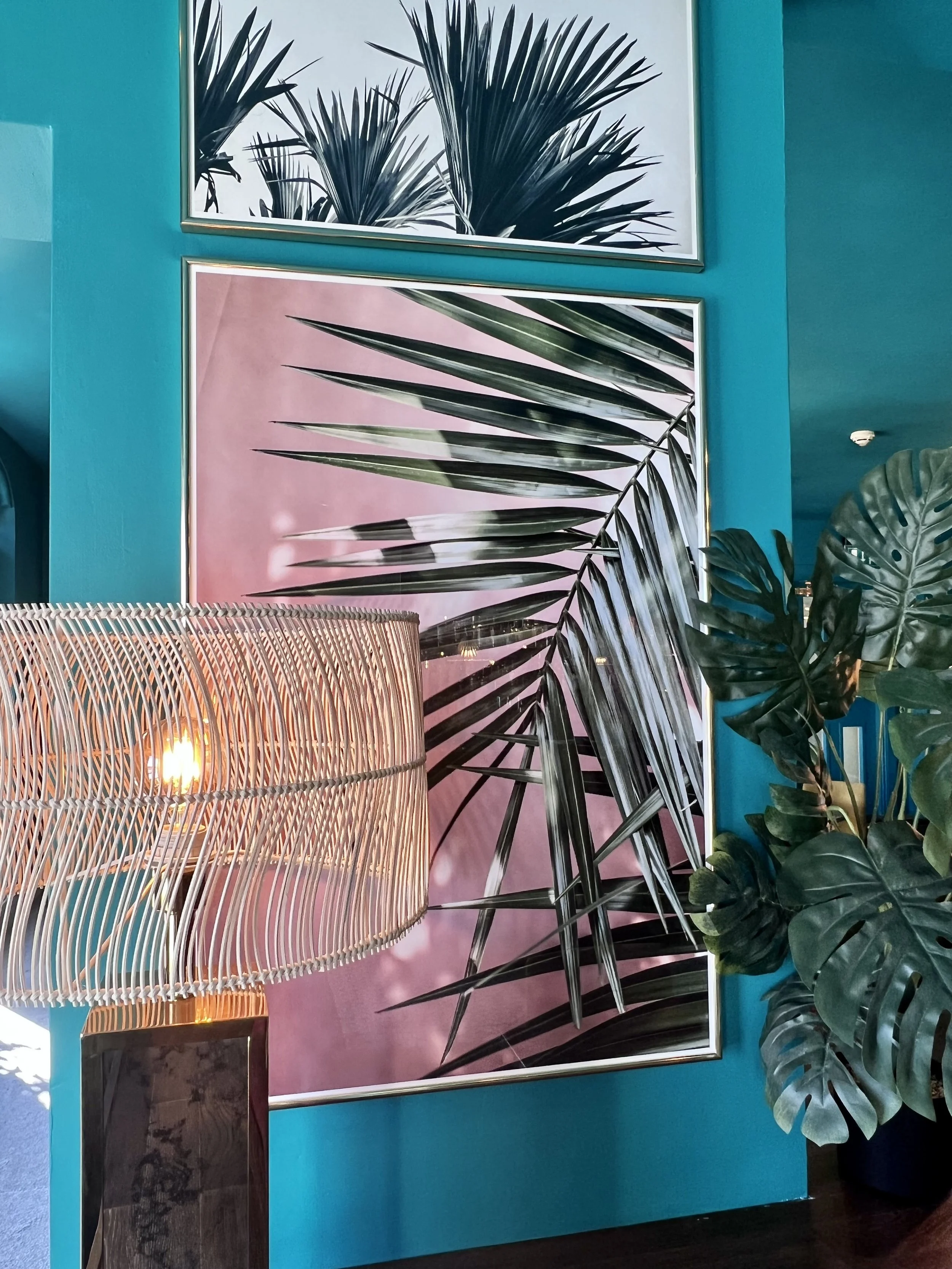 Throughout the space, bright teal walls contrast with warm pink, burgundy, and gleaming gold accents- extensive lush greenery make the restaurant come alive. Darker elements—including dark wood floors, black columns and metalwork and antique smoked mirrors—help reflect and distribute light throughout.