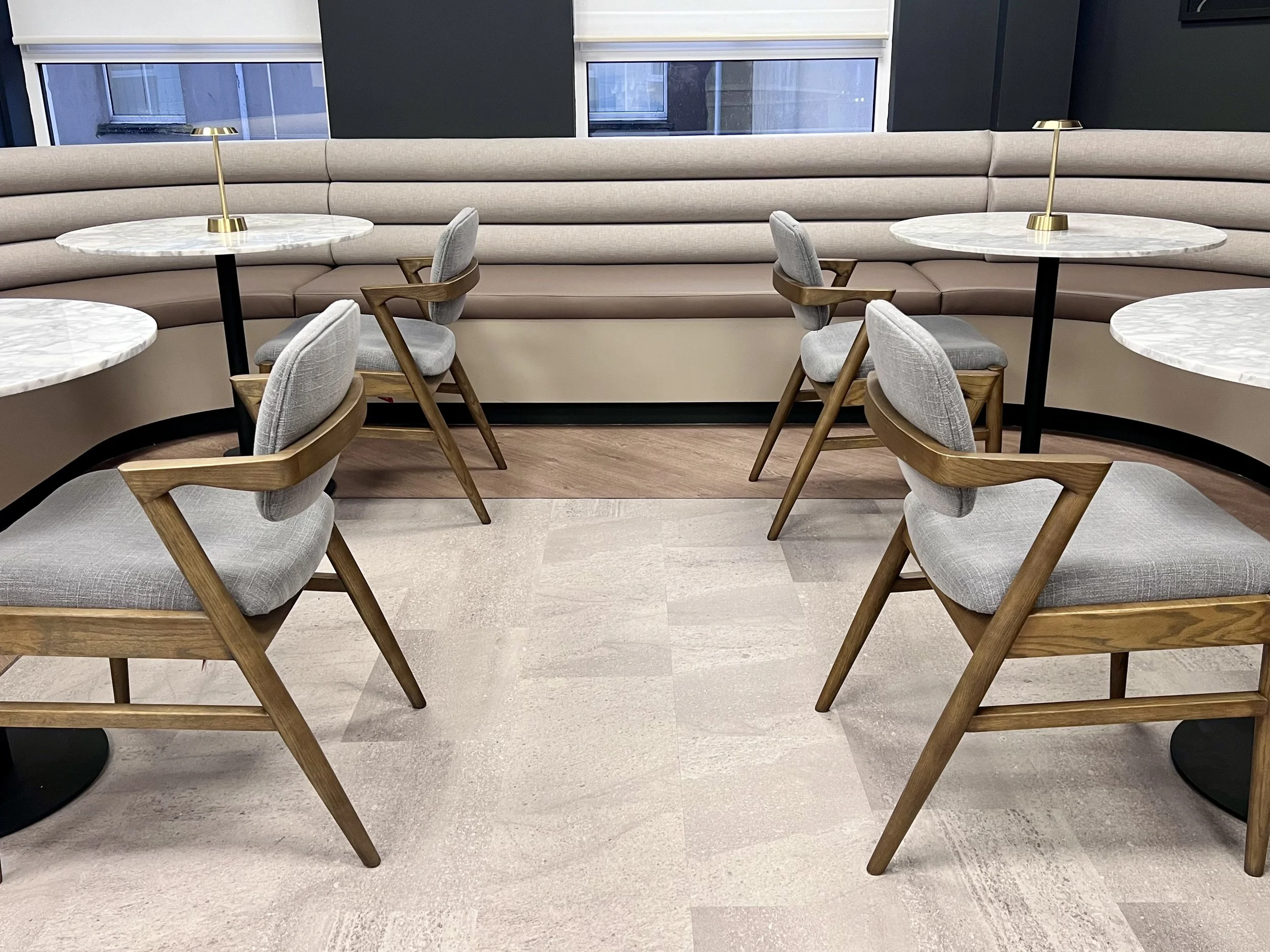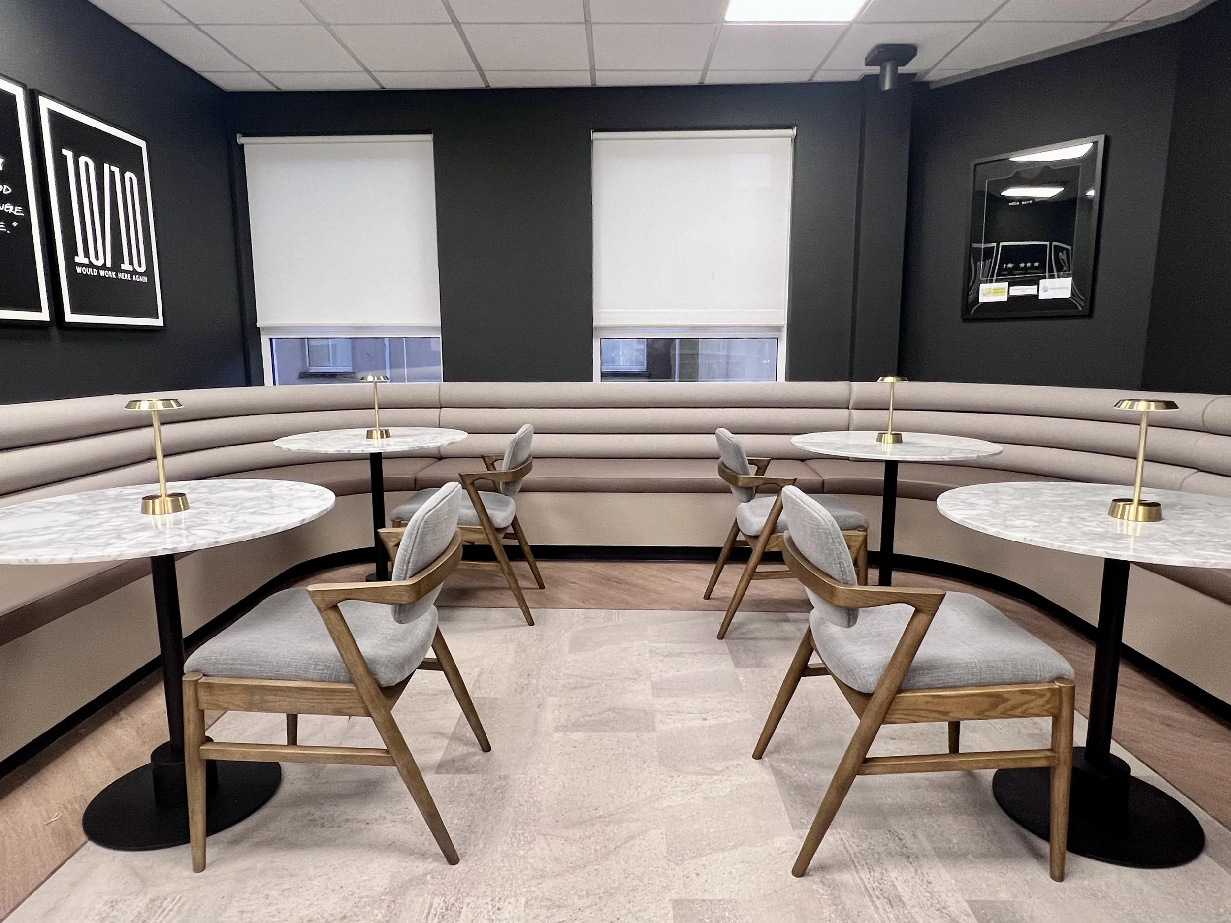 The main speakeasy-style kitchen and dining space features comfortable bench seating—perfect for team meetings and brainstorming sessions. Marble tabletops, brass accents, and rich oak-legged dining chairs create a luxurious bistro ambiance. The impressive fixed bench seating curves organically around the perimeter walls, adding both comfort and earthy texture to the space.