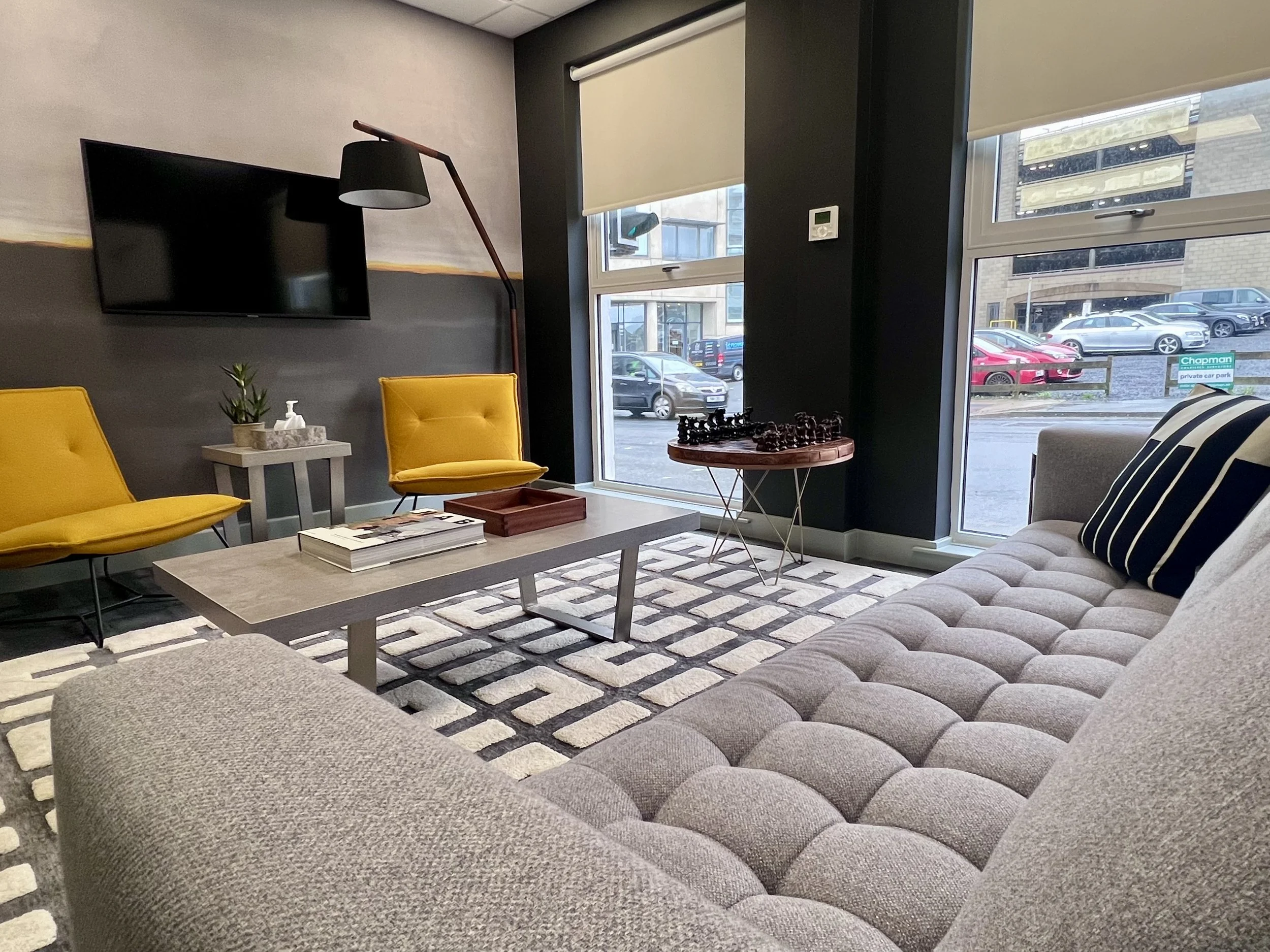 The reception area makes an immediate impact on visitors. A confident atmosphere pervades the space, defined by dramatic wallpaper, bright yellow armchairs, and a huge black tubular metal bookcase filled with carefully curated decor pieces. A record player and vintage record collection establishes a laid-back, cool vibe, while a repurposed hardwood chessboard serves as a side table beside a low-slung sofa with bold monochrome cushions. Above, an oak-framed contemporary artwork depicts a man in mid-dive.