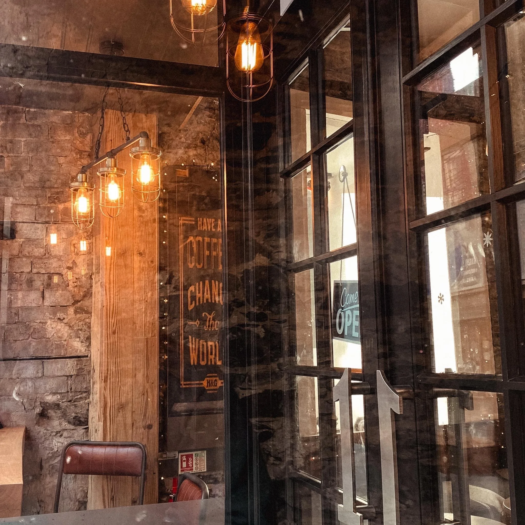 In a room of exposed solid stone, lighting was crucial. Exposed steel conduit bulkhead wall lights and suspended Edison filament bulbs were draped from the vertical axis of the space to add a warm, welcoming yet vintage atmosphere. Decorative reclaimed architectural oak and glass bank doors were re-engineered into impressive 3-metre tall wall installations, backlit around the perimeter with LED strips. Added to this were custom-made large-scale vintage signage and rebellious design features such as a bright white LED neon cross positioned centrally high above the bar—because coffee and cocktails is a religion; this is our church.